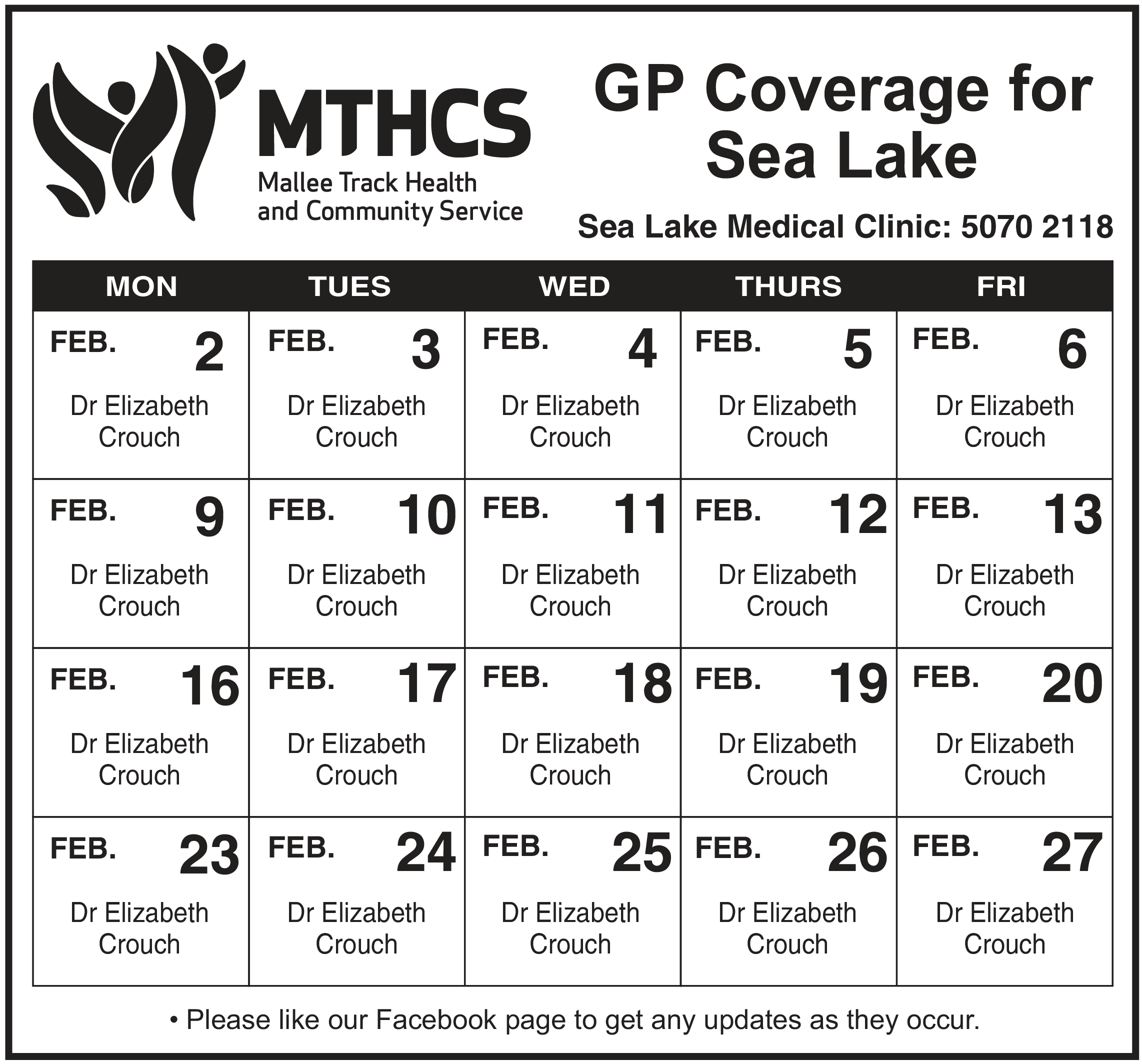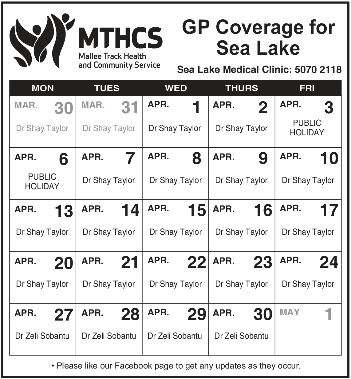 Our Sea Lake Medical Clinic is currently covered by interchanging locum doctors, Monday to Friday. Please see attached calendar for GP coverage below.