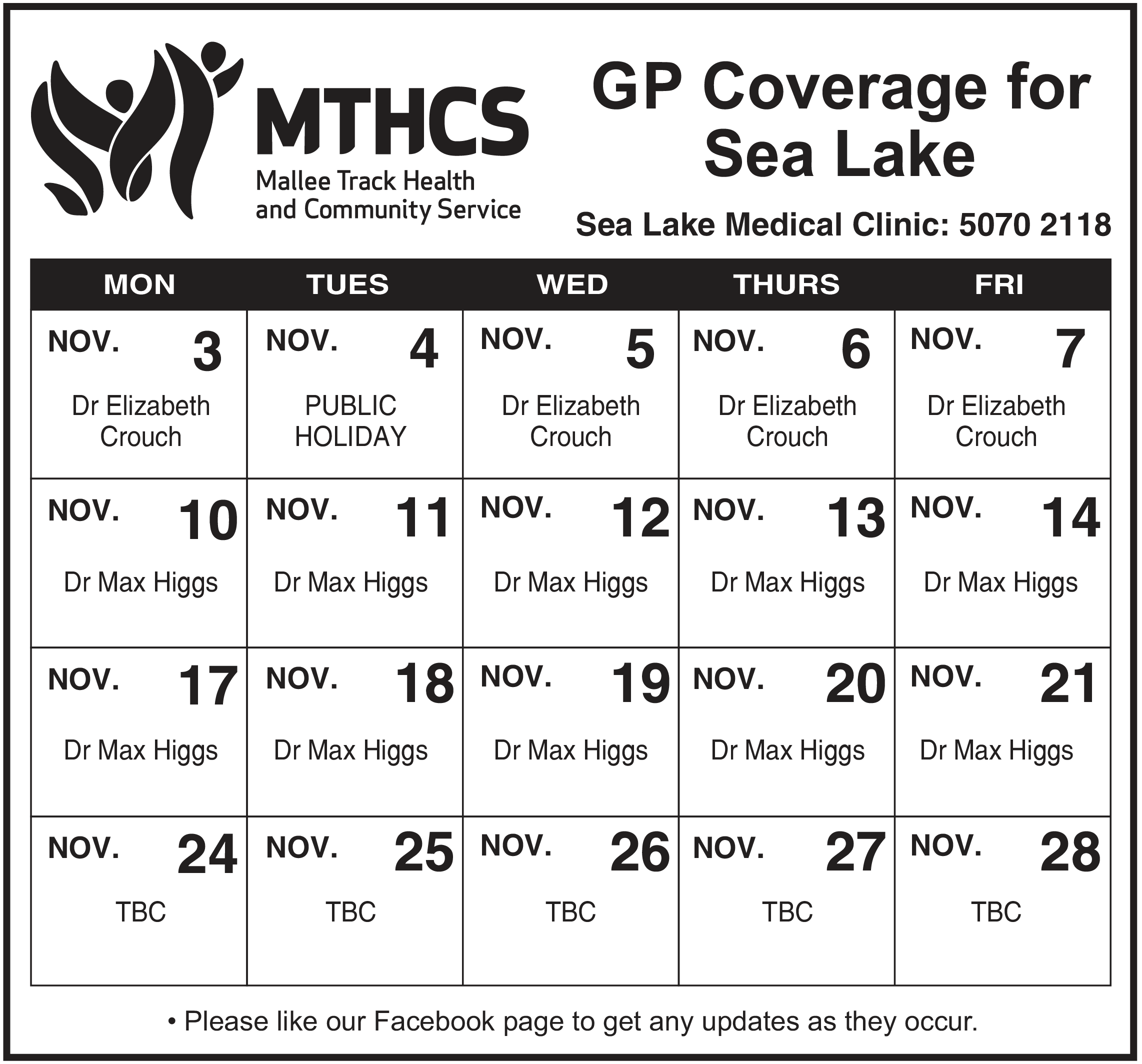 Our Sea Lake Medical Clinic is currently covered by interchanging locum doctors, Monday to Friday. Please see attached calendar for GP coverage. A Practice Nurse is also available for appointments at various times.