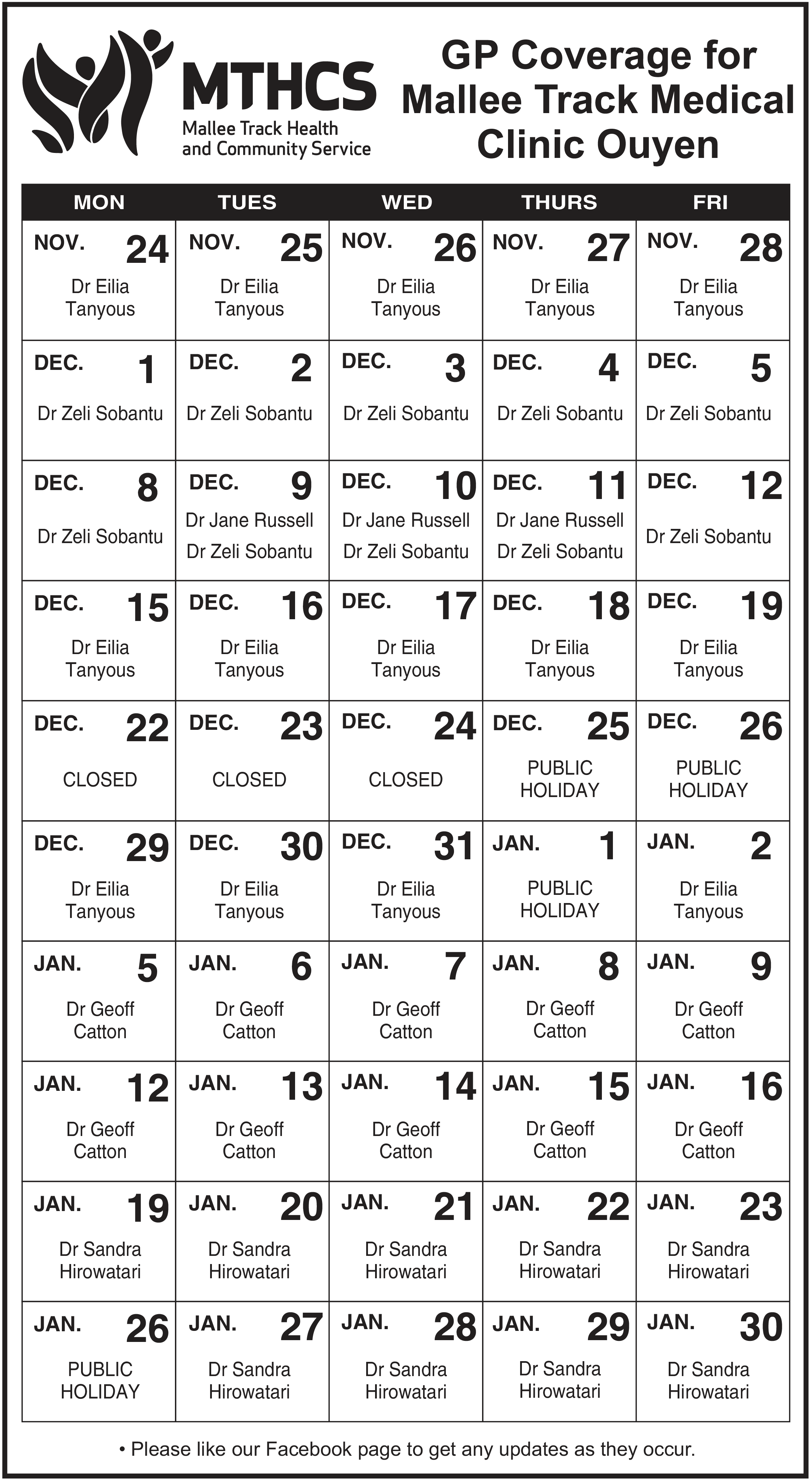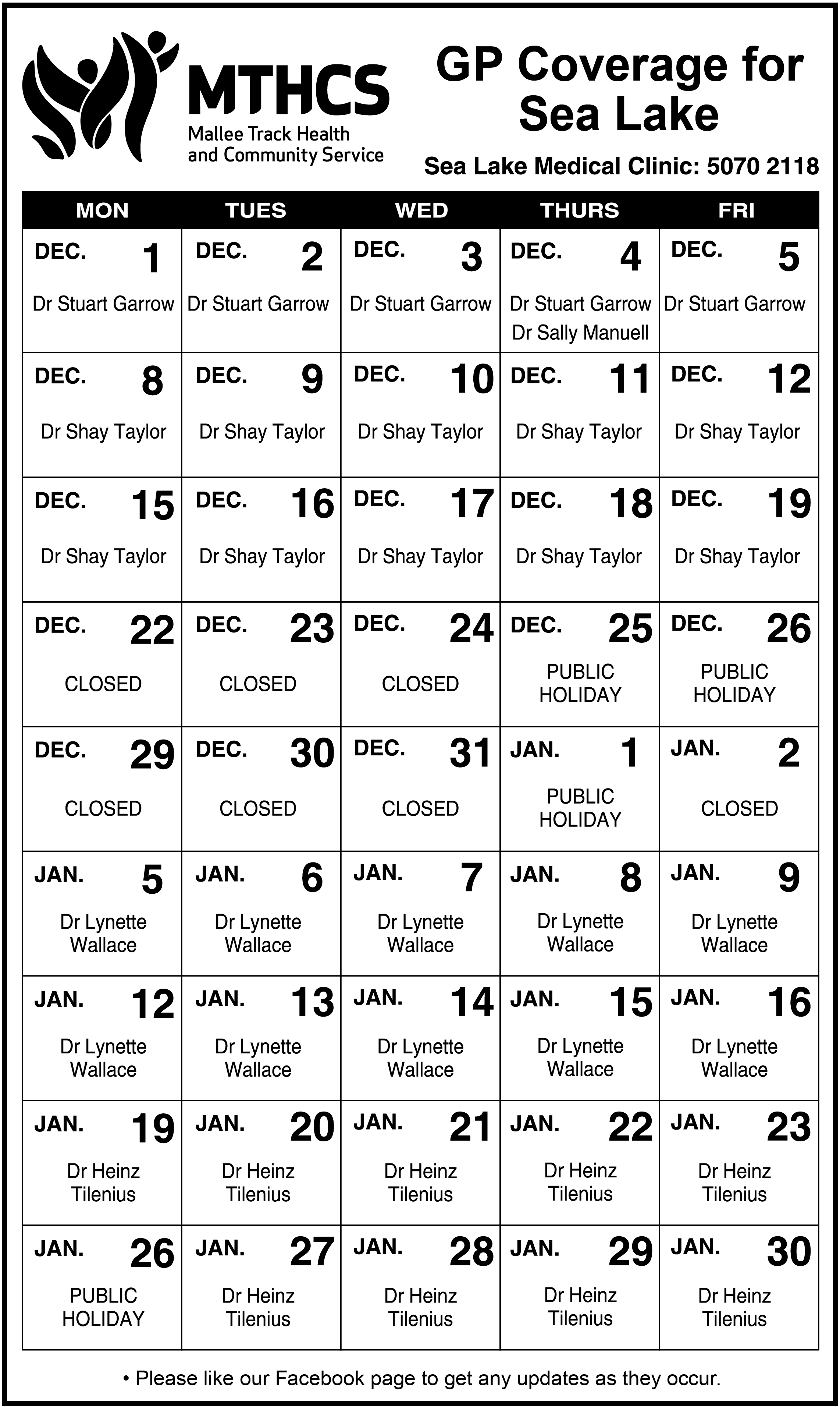 Rotating Locum GPs cover on short term and long term placements at our Ouyen and Sea Lake Medical Clinics. To see the latest GP schedule please check the calendar below.