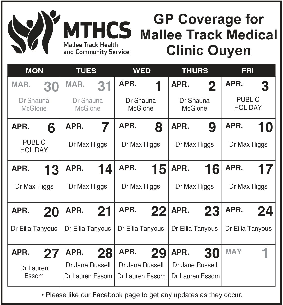 MTHCS collaborates with Mallee Border Health to provide primary healthcare and medical services in Underbool and Murrayville. The current arrangement